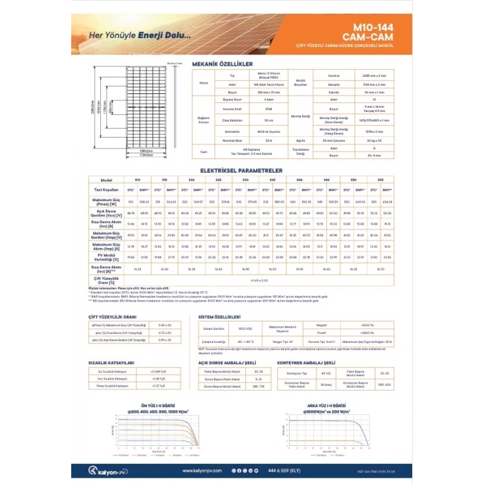 Kalyon’un 550W gücündeki M10 sınıfı paneli, yüksek verimli monokristal hücre yapısıyla yıl boyunca kararlı üretim sunar. Düşük sıcaklık katsayısı sayesinde sıcak yaz günlerinde bile performans kaybı minimum seviyededir.