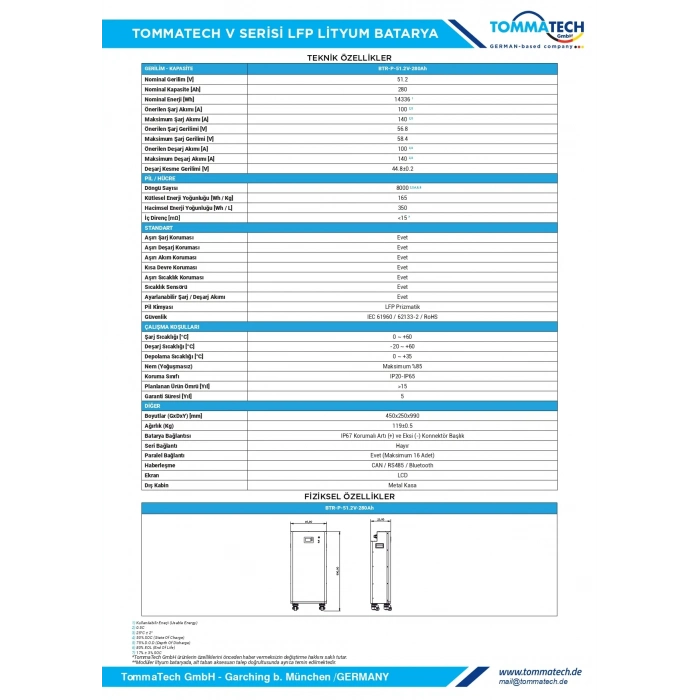 TommaTech Modüler V Serisi 51.2V 280Ah LFP Lityum Batarya, yüksek kapasiteli LiFePO₄ hücre teknolojisi, aktif BMS yapısı ve modüler mimarisi ile konut, ticari ve endüstriyel enerji depolama sistemleri için geliştirilmiş uzun ömürlü ve güvenli bir çözümdür.