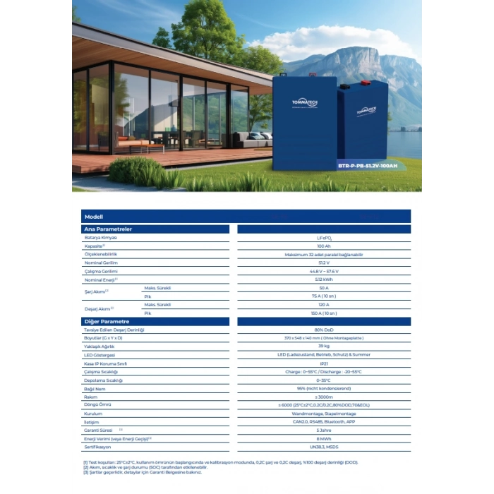 TommaTech PB Serisi 51.2 V 100Ah LFP (LiFePO₄) Lityum Batarya, solar enerji sistemleri, off-grid evler, hibrit sistemler, karavan, bağ evi veya tesislerde güvenilir ve uzun ömürlü enerji depolama çözümü sunar. LiFePO₄ kimyası sayesinde stabil, termal olarak güvenli ve yüksek döngü ömürlü bir batarya deneyimi sağlar.