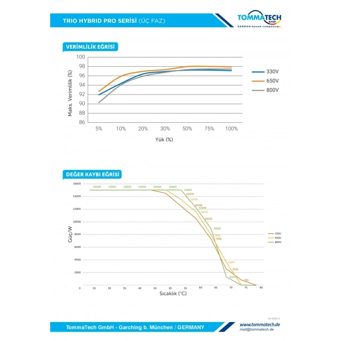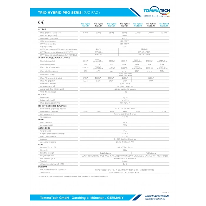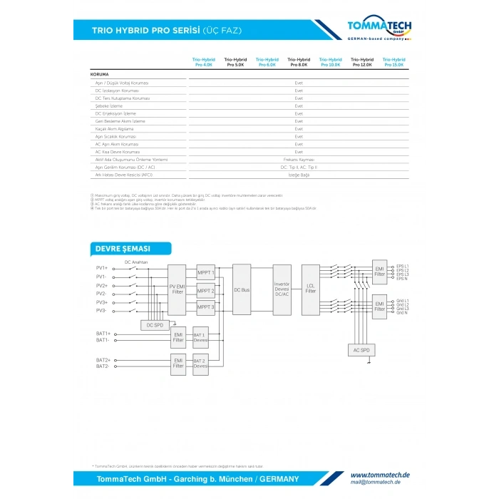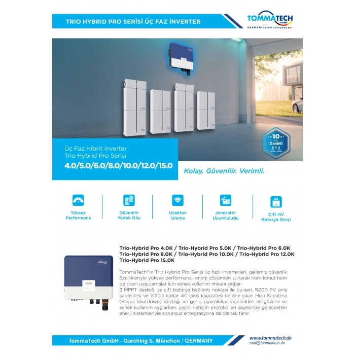 TommaTech Trio Hybrid Pro 15 kW, hem on-grid hem off-grid çalışabilen gelişmiş hibrit inverter teknolojisine sahiptir. Yüksek voltajlı (HV) lityum batarya uyumluluğu, yüksek şarj/deşarj kapasitesi, 3 bağımsız MPPT ve çoklu çalışma modlarıyla konut, ticari işletme ve endüstriyel projelerde kesintisiz enerji yönetimi sunar.